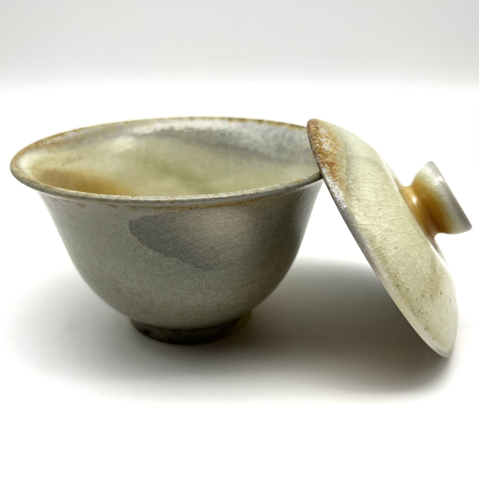 Eine junge Keramikkünstlerin hat sich nach ihrem Studium an der Jingdezhen Keramik-Hochschule in Taoxichuan, einem von Künstlern besiedelten Ortsteil von Jingdezhen, ihre Werkstatt mit einer kleinen Galerie eingerichtet. Sie hat sich auf im Holzofen gebrannte Tee-Keramik spezialisiert. Dieser zarte Gaiwan besticht durch seine harmonische Form und dem leichten Krakelee seiner Glasur. In Inneren sieht man Spuren von Pinienholzöl Ablagerungen, die während des Brennvorgangs entstehen.